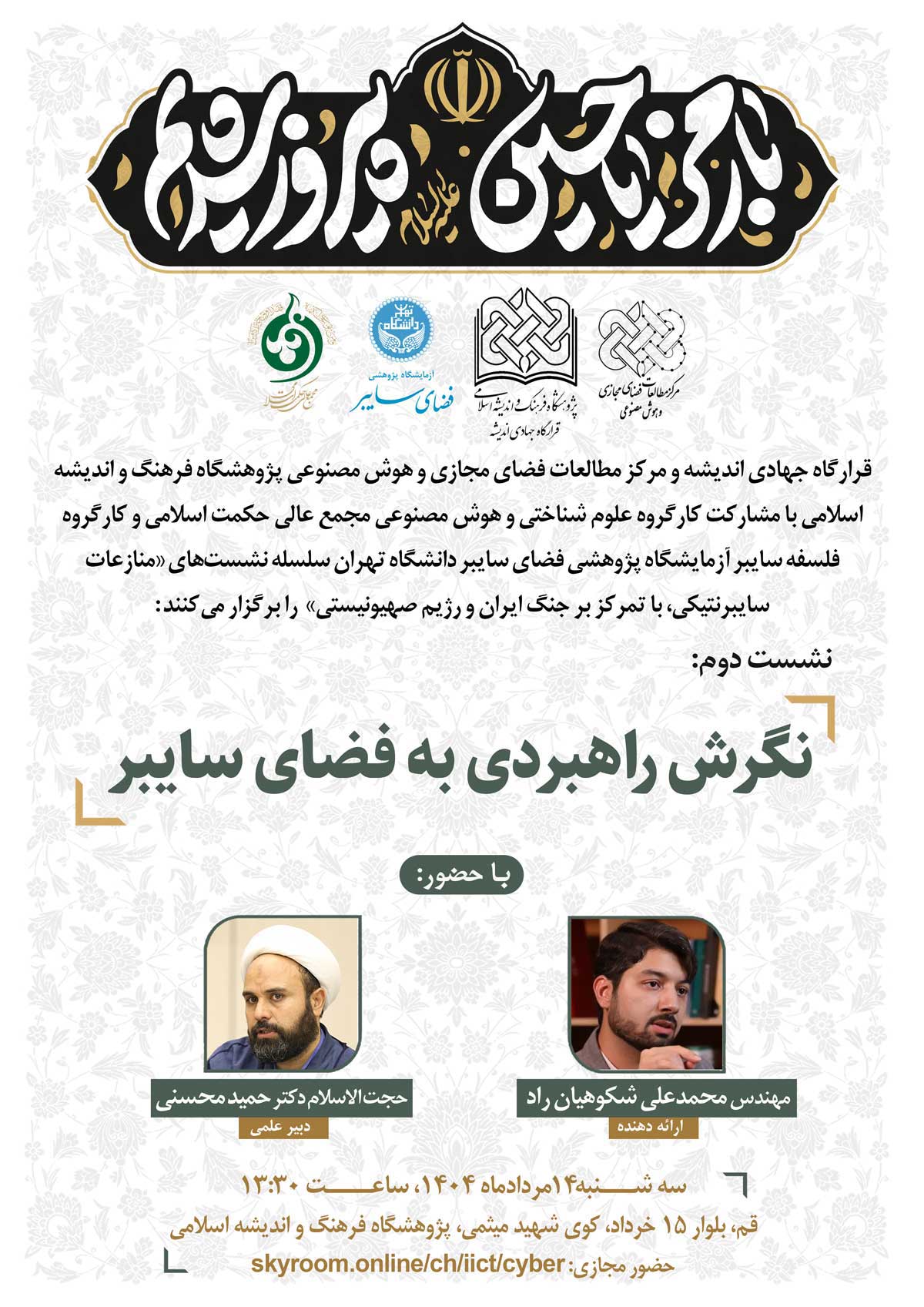 نشست علمی با موضوع “نگرش راهبردی به فضای سایبر” روز سه شنبه ۱۴ مردادماه ۱۴۰۴ ساعت ۱۳:۳۰ به صورت حضوری در سالن جلسات پژوهشگاه فرهنگ و اندیشه اسلامی به نشانی: قم، بلوار ۱۵ خرداد، کوی شهید میثمی و همچنین به صورت مجازی تحت نرم افزار اسکایروم برگزار میشود.