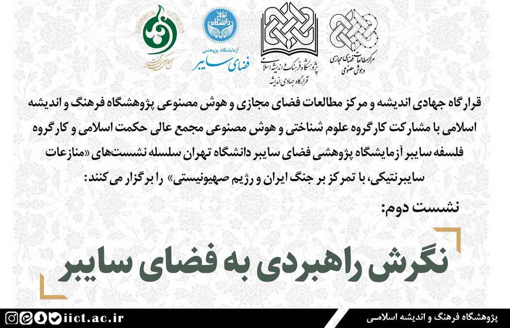 به گزارش روابط عمومی پژوهشگاه فرهنگ و اندیشه اسلامی، نشست علمی دوم با موضوع “نگرش راهبردی به فضای سایبر” از سلسله نشست های “منازعات سایبرنتیکی، با تمرکز بر جنگ ایران و رژیم صهیونیستی ” توسط قرارگاه جهادی اندیشه و مرکز مطالعات فضای مجازی و هوش مصنوعی پژوهشگاه با مشارکت کارگروه علوم شناختی و هوش مصنوعی مجمع عالی حکمت اسلامی و کارگروه فلسفه سایبر آزمایشگاه پژوهشی فضای سایبر دانشگاه تهران به صورت حضوری و مجازی برگزار میشود.