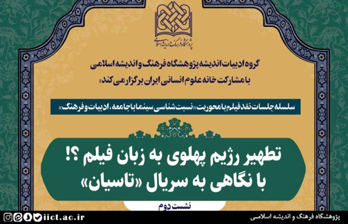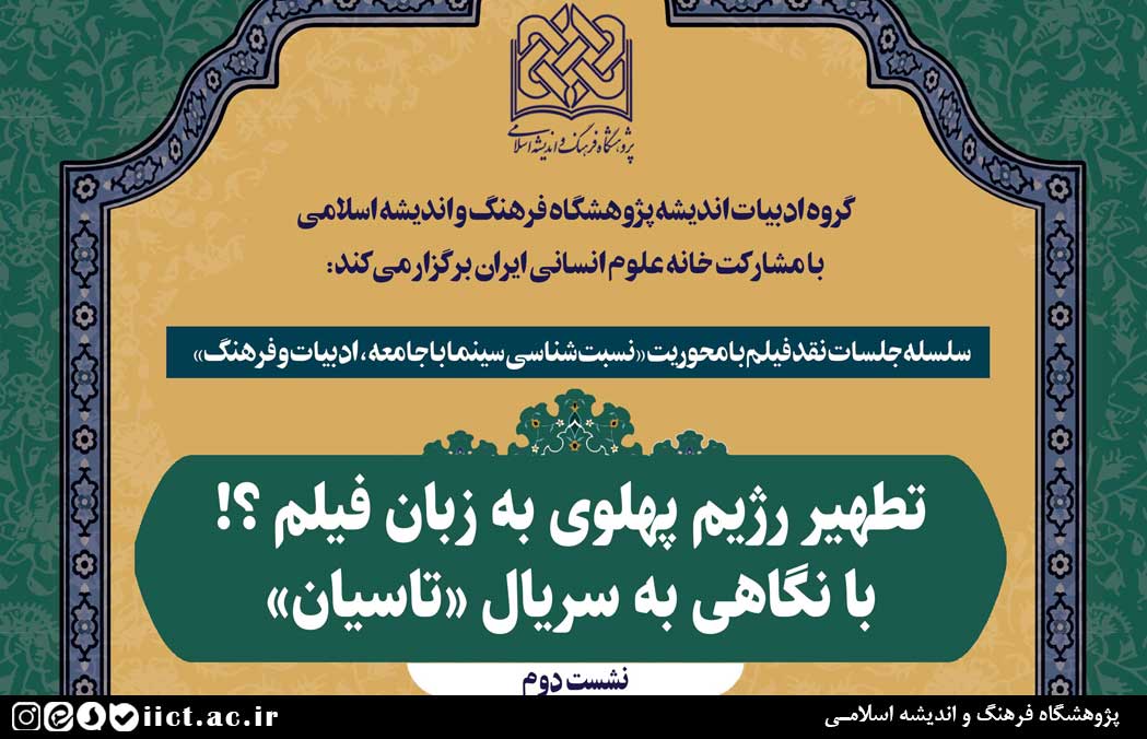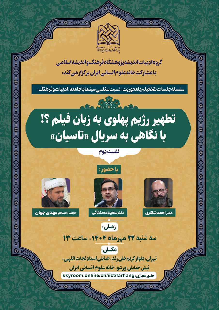 نشست علمی با موضوع “تطهیر رژیم پهلوی به زبان فیلم؟! با نگاهی به سریال «تاسیان»” روز سهشنبه ۲۲ مهر ماه ۱۴۰۴، ساعت ۱۳ به صورت حضوری در سالن جلسات خانه علوم انسانی ایران به نشانی: تهران، میدان هفت تیر، بلوار کریم خان زند، خیابان استاد نجات اللهی (ویلا)، نبش خیابان ورشو و همچنین به صورت مجازی تحت نرم افزار اسکایروم برگزار میشود.