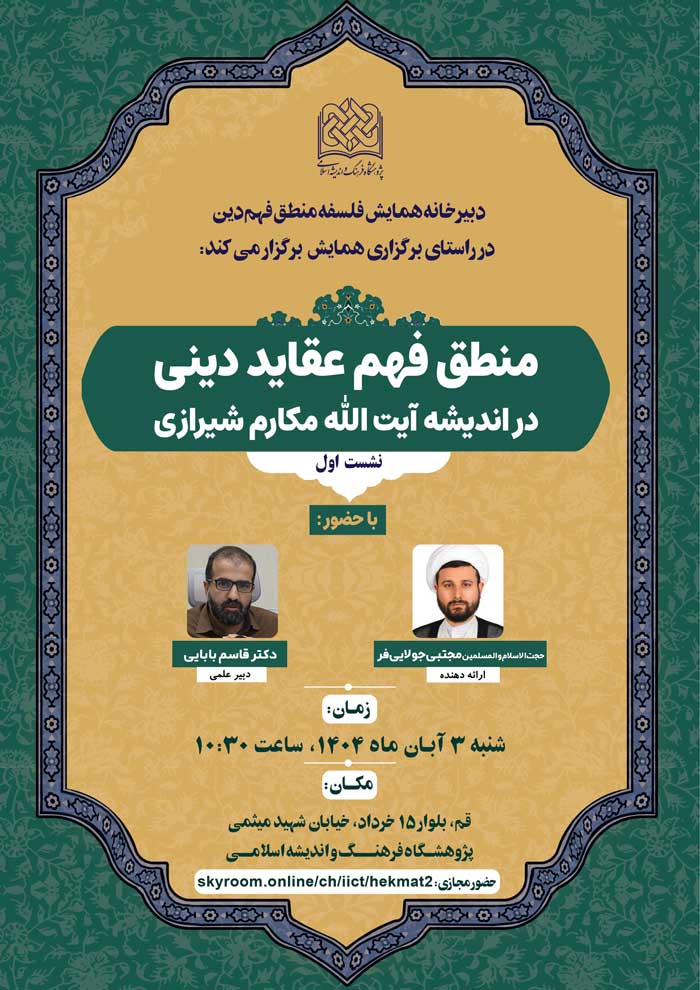 نشست علمی با موضوع “منطق فهم عقاید دینی در اندیشه آیت الله مکارم شیرازی” روز شنبه سوم آبان ماه سال جاری ساعت ۱۰:۳۰ در سالت جلسات پژوهشگاه فرهنگ و اندیشه اسلامی به نشانی: قم، بلوار ۱۵ خرداد، کوی شهید میثمی و همچنین به صورت مجازی برگزار میشود.