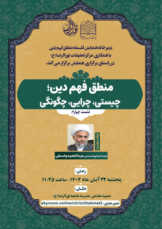 نشست علمی با موضوع “منطق فهم دین؛ چیستی، چرایی، چگونگی” روز پنج شنبه ۲۲ آبان ماه سال جاری ساعت ۱۱:۴۵ به نشانی: مشهد، مدرسه علمیه نورالرضا علیه السلام و همچنین به صورت مجازی برگزار میشود.