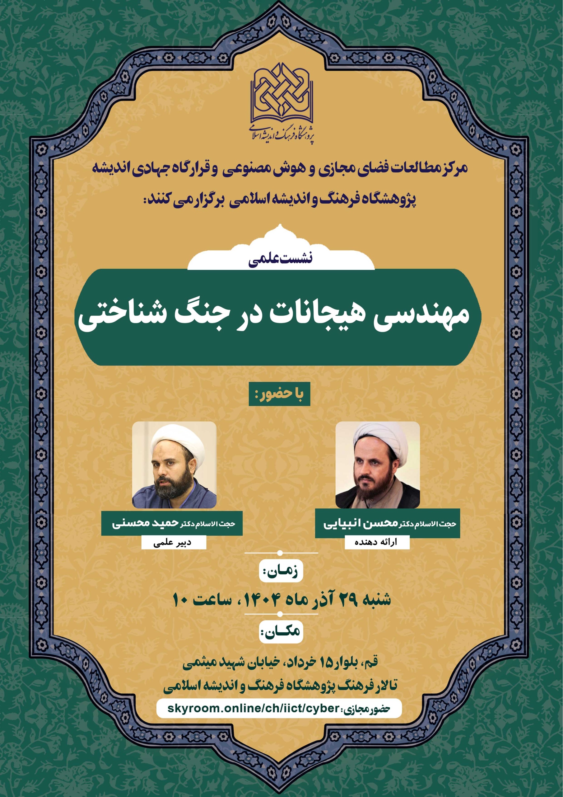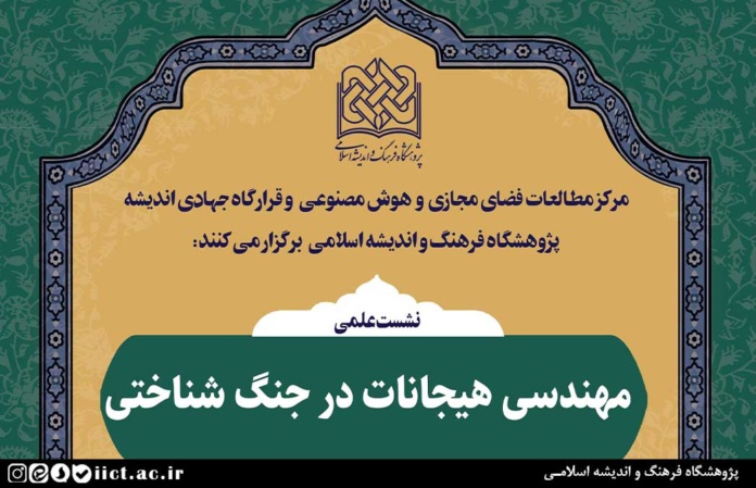 نشست علمی با موضوع “مهندسی هیجانات در جنگ شناختی ” روز شنبه ۲۹ آذر ماه سال جاری ساعت ۱۰ در تالارفرهنگ پژوهشگاه فرهنگ و اندیشه اسلامی به نشانی: قم، خیابان ۱۵ خرداد، خیابان شهید میثمی و همچنین به صورت مجازی برگزار میشود.