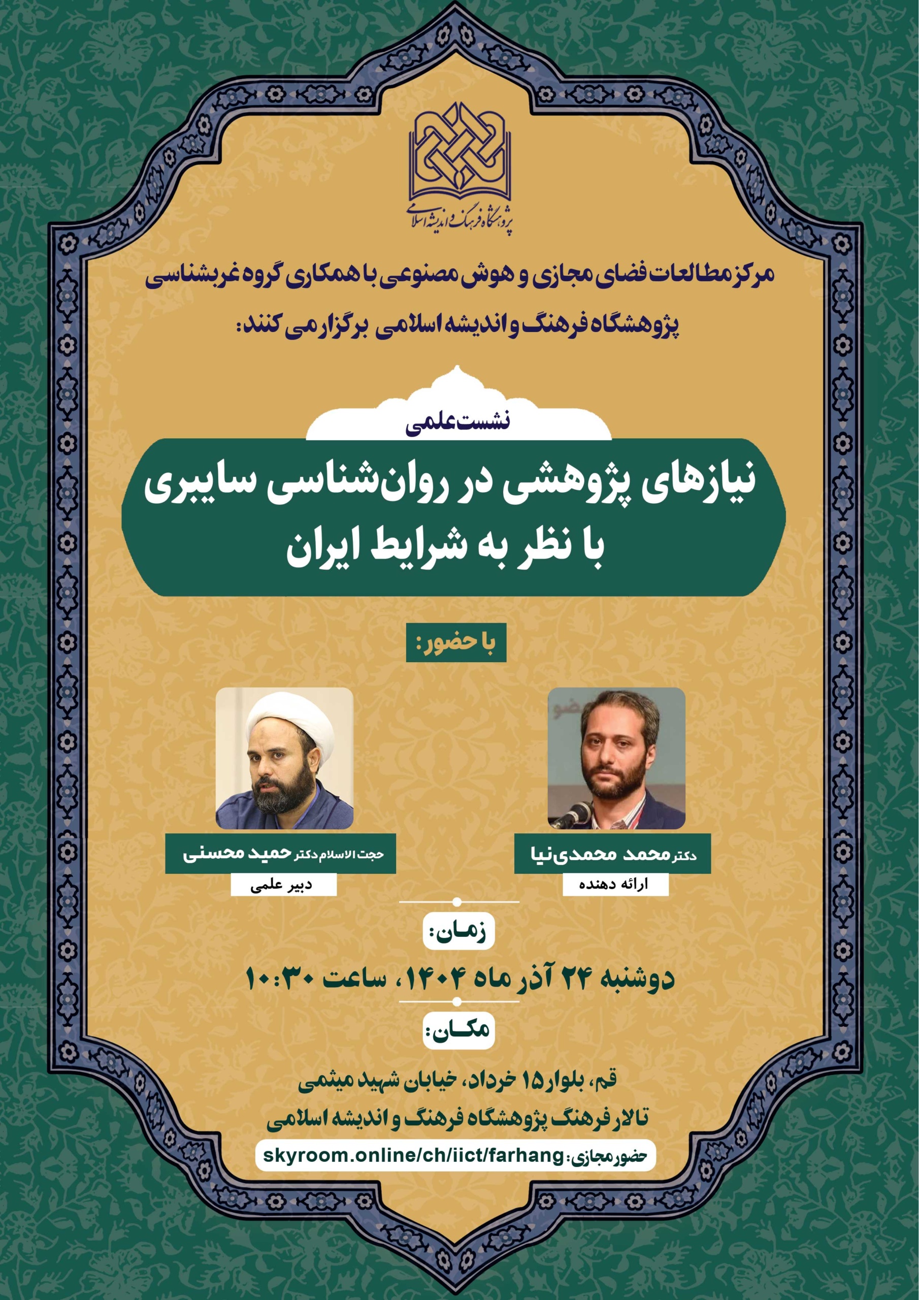 به گزارش روابط عمومی پژوهشگاه فرهنگ و اندیشه اسلامی، نشست علمی «نیازهای پژوهشی در روانشناسی سایبری با نظر به شرایط ایران» توسط مرکز مطالعات فضای مجازی و هوش مصنوعی با همکاری گروه غربشناسی پژوهشگاه فرهنگ و اندیشه اسلامی به صورت حضوری و مجازی برگزار میشود.