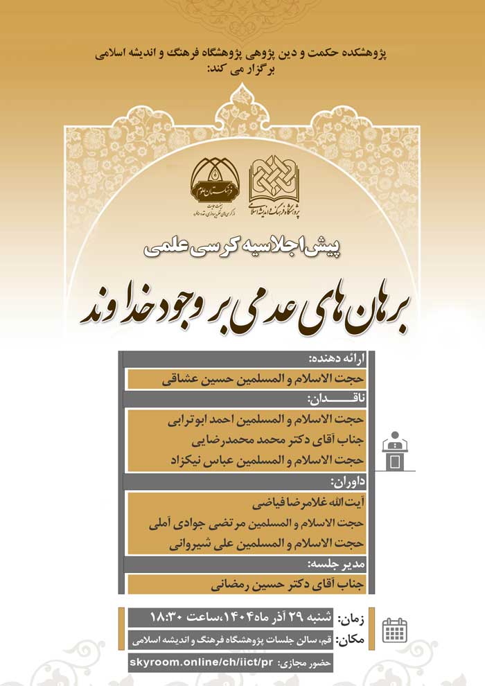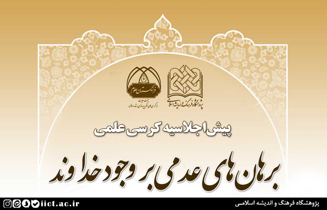 پیشاجلاسیه کرسی علمی با موضوع “برهانهای عدمی بر وجود خداوند” روز شنبه ۲۹ آذرماه ۱۴۰۴، ساعت ۱۸:۳۰ به صورت حضوری در تالار فرهنگ پژوهشگاه فرهنگ و اندیشه اسلامی به نشانی: قم، بلوار ۱۵خرداد، کوی شهید میثمی و همچنین به صورت مجازی تحت نرم افزار اسکایروم برگزار میشود.