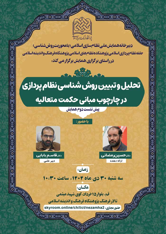 نشست علمی با موضوع «تحلیل و تبیین روش شناسی نظام پردازی در چارچوب مبانی حکمت متعالیه» روز سه شنبه ۳۰ دی ماه ۱۴۰۴، ساعت ۱۰:۳۰ در تالار فرهنگ پژوهشگاه فرهنگ و اندیشه اسلامی به نشانی قم، بلوار ۱۵ خرداد، کوی شهید میثمی و همچنین به صورت مجازی برگزار میشود.