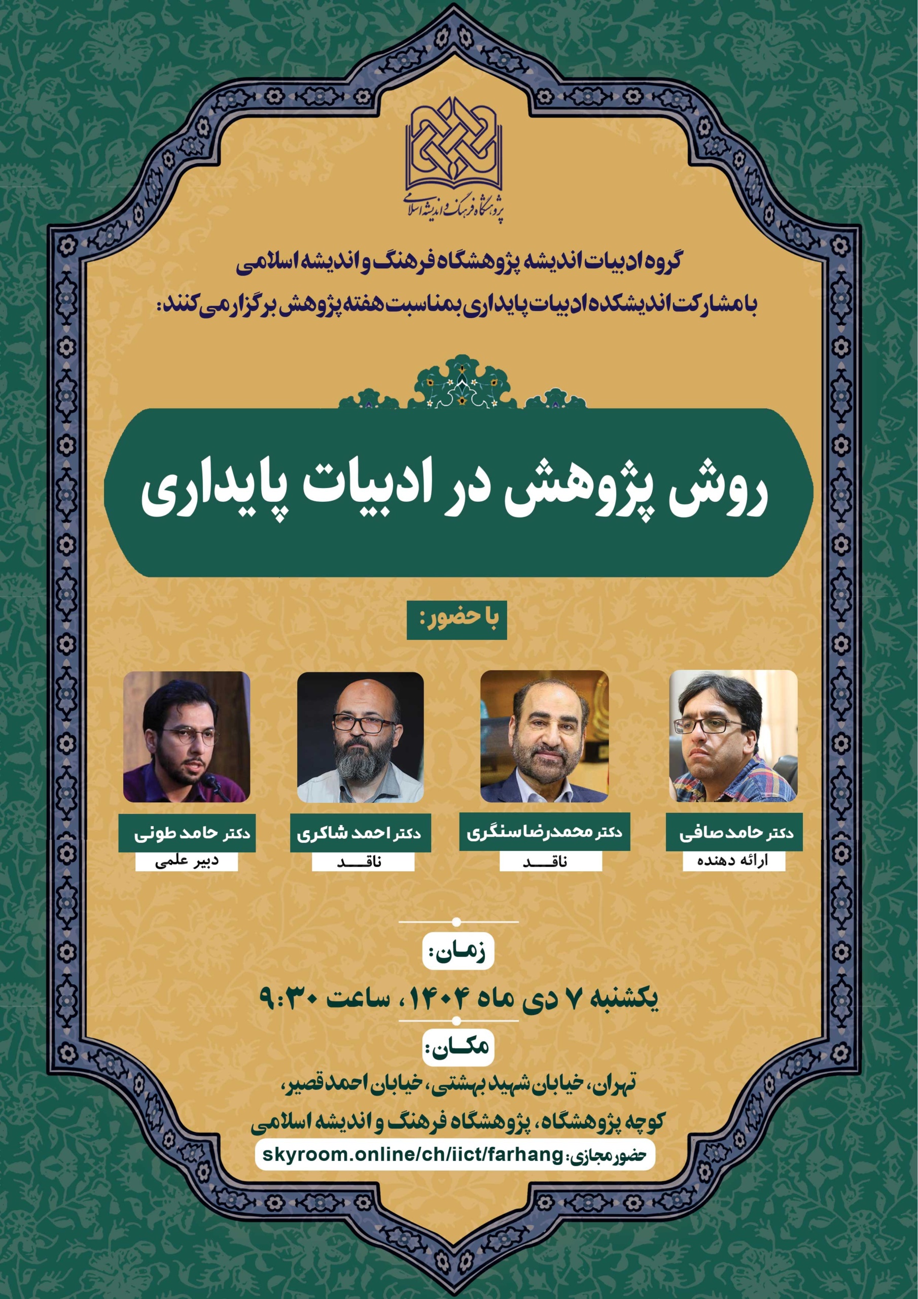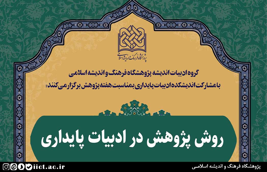 نشست علمی با موضوع “روش پژوهش در ادبیات پایداری” روز یکشنبه ۷ دی ماه سال جاری ساعت ۹:۳۰ درسالن جلسات پژوهشگاه فرهنگ و اندیشه اسلامی به نشانی: تهران، خیابان شهید بهشتی، خیابان احمد قصیر، کوچه پژوهشگاه، پژوهشگاه فرهنگ و اندیشه اسلامی و همچنین به صورت مجازی برگزار میشود.