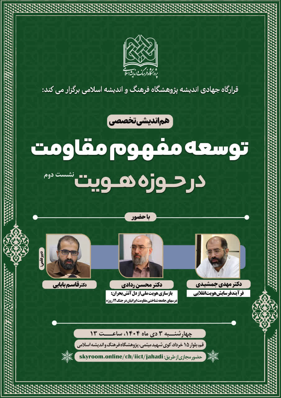 این هم اندیشی با حضور و ارائه اساتید گرانقدر: دکتر مهدی جمشیدی (فرآیند فرسایش هویت انقلابی) و دکتر محسن ردادی (بازسازی هویت ملی از دل آتش بحران: درسهای جامعه شناختی مقاومت ایرانیان در جنگ ۱۲ روزه) برگزار می گردد.