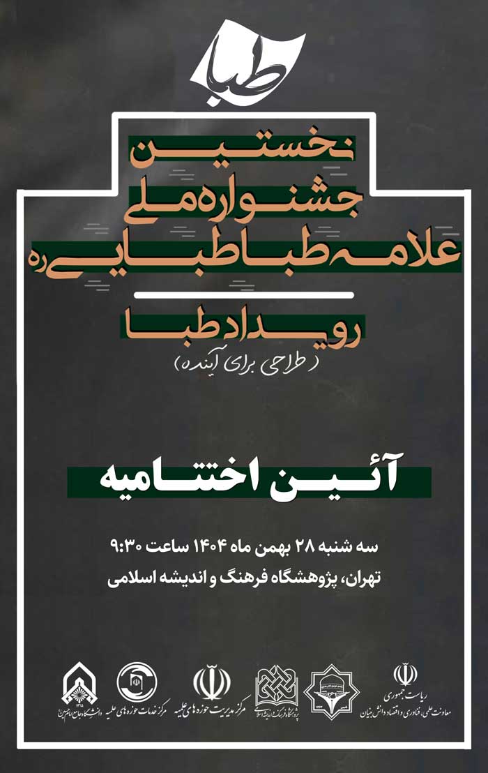 آئین اختتامیه نخستین جشنواره ملی علامه طباطبایی(ره) رویداد طبا(طراحی برای آینده) سه شنبه ۲۸ بهمن ماه ۱۴۰۴، ساعت ۹:۳۰ صبح در تالار علامه جعفری(ره) پژوهشگاه فرهنگ و اندیشه اسلامی به نشانی تهران، خیابان شهید بهشتی، خیابان احمد قصیر، کوچه پژوهشگاه، پلاک ۲ برگزار می شود.