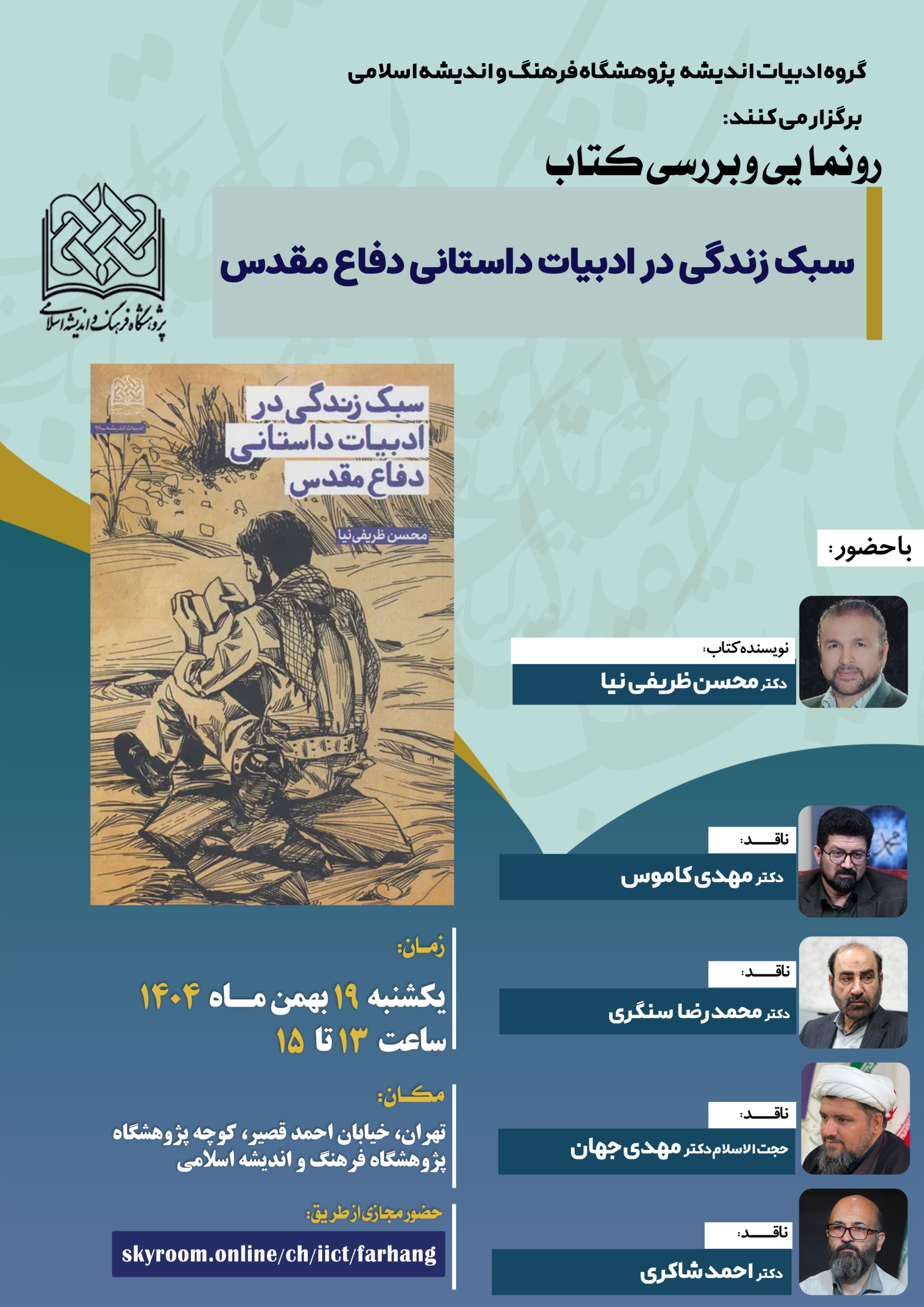 نشست رونمایی و بررسی کتاب سبک زندگی در ادبیات داستانی دفاع مقدس روز یکشنبه ۱۹ بهمن ماه سال جاری ساعت ۱۳ به صورت حضوری در سالن جلسات پژوهشگاه به نشانی تهران، خیابان شهید بهشتی، خیابان احمد قصیر، کوچه پژوهشگاه، پلاک ۲ به صورت حضوری و مجازی برگزار میشود.