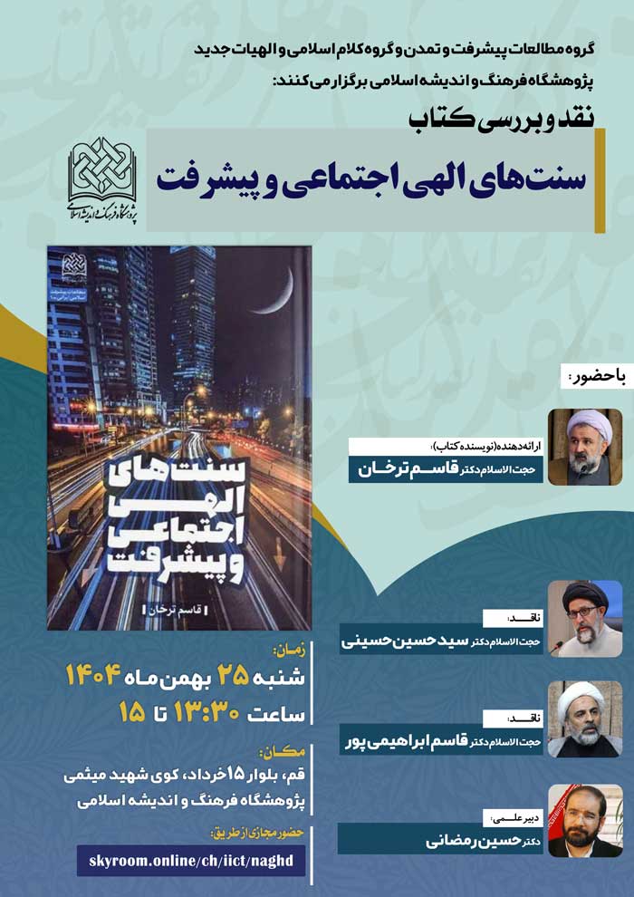 نشست علمی بررسی و نقد کتاب «سنتهای الهی اجتماعی و پیشرفت » روز شنبه ۲۵ بهمن ماه سال جاری ساعت ۱۳:۳۰ به صورت حضوری در تالار فرهنگ پژوهشگاه فرهنگ و اندیشه اسلامی به نشانی قم، بلوار ۱۵خرداد، کوی شهید میثمی برگزار و همچنین مجازی برگزار میشود.