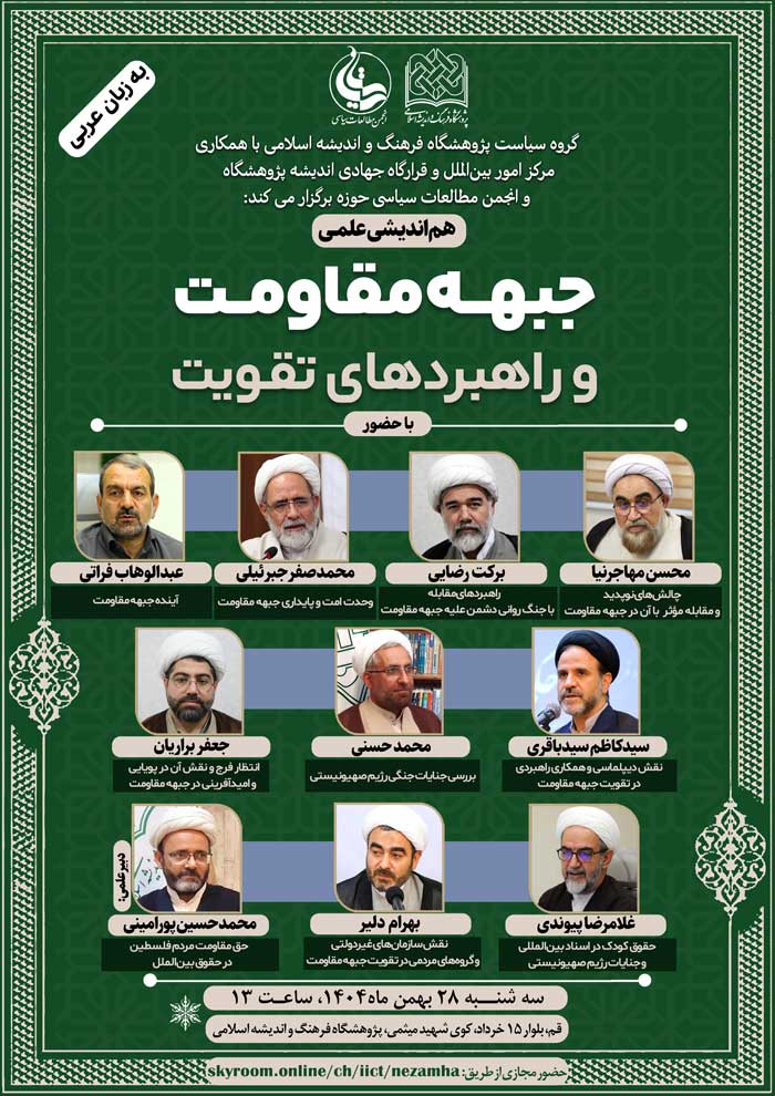 هم اندیشی علمی با موضوع “جبهه مقاومت و راهبردهای تقویت” روز سه شنبه ۲۸ بهمن ماه ۱۴۰۴ ساعت ۱۳ به صورت حضوری در سالن جلسات پژوهشگاه فرهنگ و اندیشه اسلامی به نشانی: قم، بلوار ۱۵ خرداد، کوی شهید میثمی و همچنین به صورت مجازی تحت نرم افزار اسکایروم برگزار میشود.