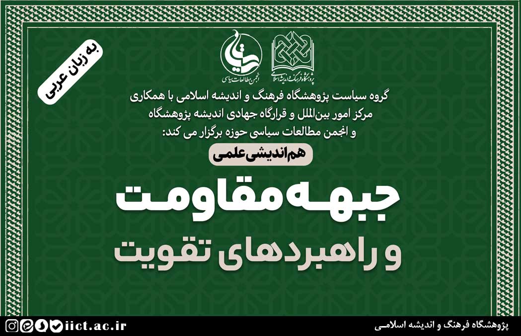 هم اندیشی علمی با موضوع “جبهه مقاومت و راهبردهای تقویت” روز سه شنبه ۲۸ بهمن ماه ۱۴۰۴ ساعت ۱۳ به صورت حضوری در سالن جلسات پژوهشگاه فرهنگ و اندیشه اسلامی به نشانی: قم، بلوار ۱۵ خرداد، کوی شهید میثمی و همچنین به صورت مجازی تحت نرم افزار اسکایروم برگزار میشود.