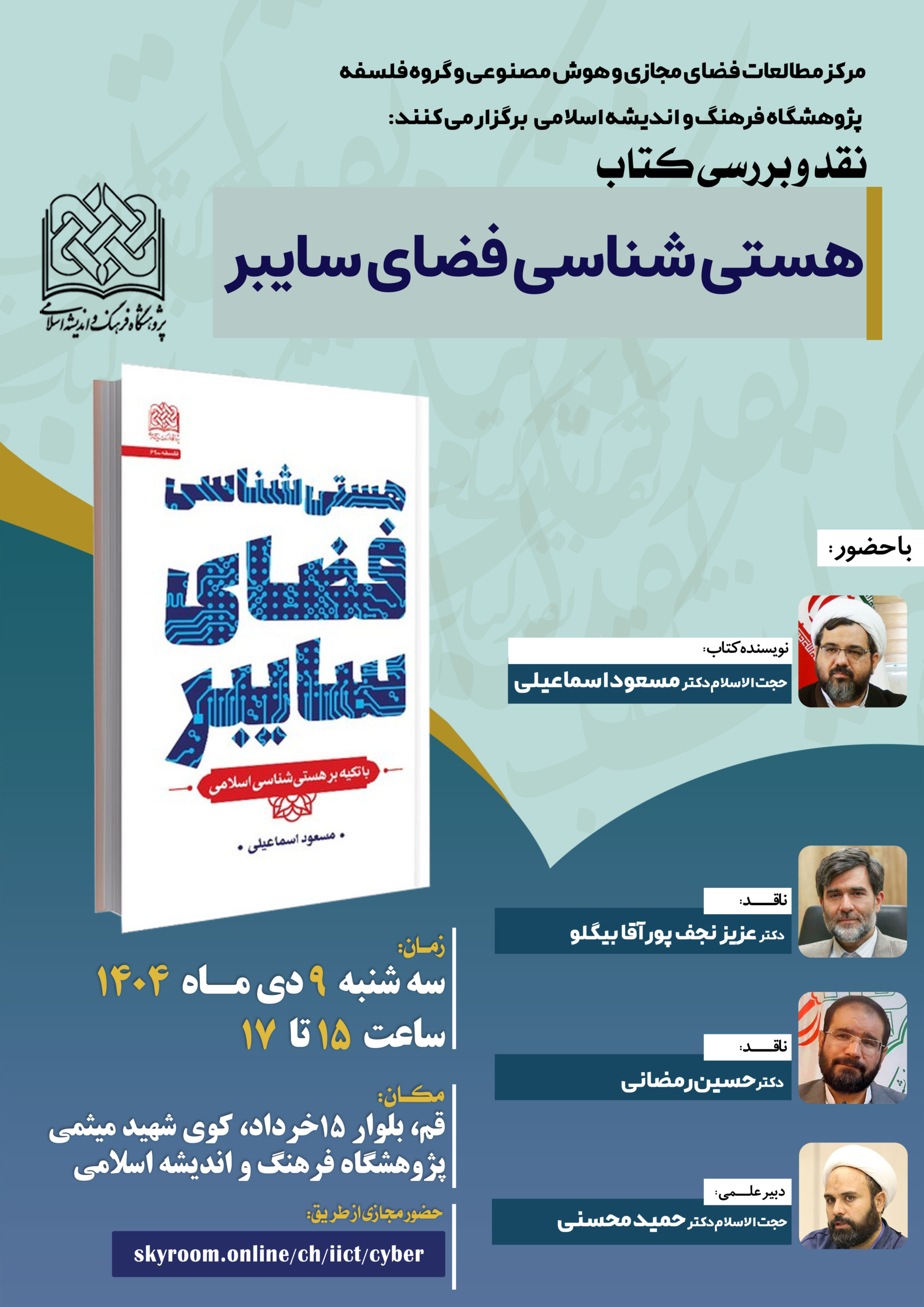 به گزارش روابط عمومی پژوهشگاه فرهنگ و اندیشه اسلامی، نشست علمی معرفی و نقد کتاب «هستی شناسی فضای سایبر» اثر دکتر مسعود اسماعیلی توسط مرکز مطالعات فضای مجازی و هوش مصنوعی و گروه فلسفه پژوهشگاه به صورت حضوری و مجازی برگزار میشود.