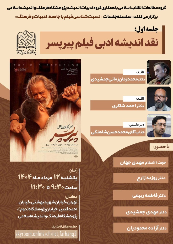 نشست علمی با موضوع “نقد اندیشه ادبی فیلم پیرپسر” روز یکشنبه ۱۲ مردادماه ۱۴۰۴ ساعت ۹:۳۰ به صورت حضوری در سالن جلسات پژوهشگاه فرهنگ و اندیشه اسلامی به نشانی: تهران، خیابان شهیدبهشتی، خیابان احمدقصیر،خیابان پژوهشگاه (دوم) و همچنین به صورت مجازی تحت نرم افزار اسکایروم برگزار میشود.